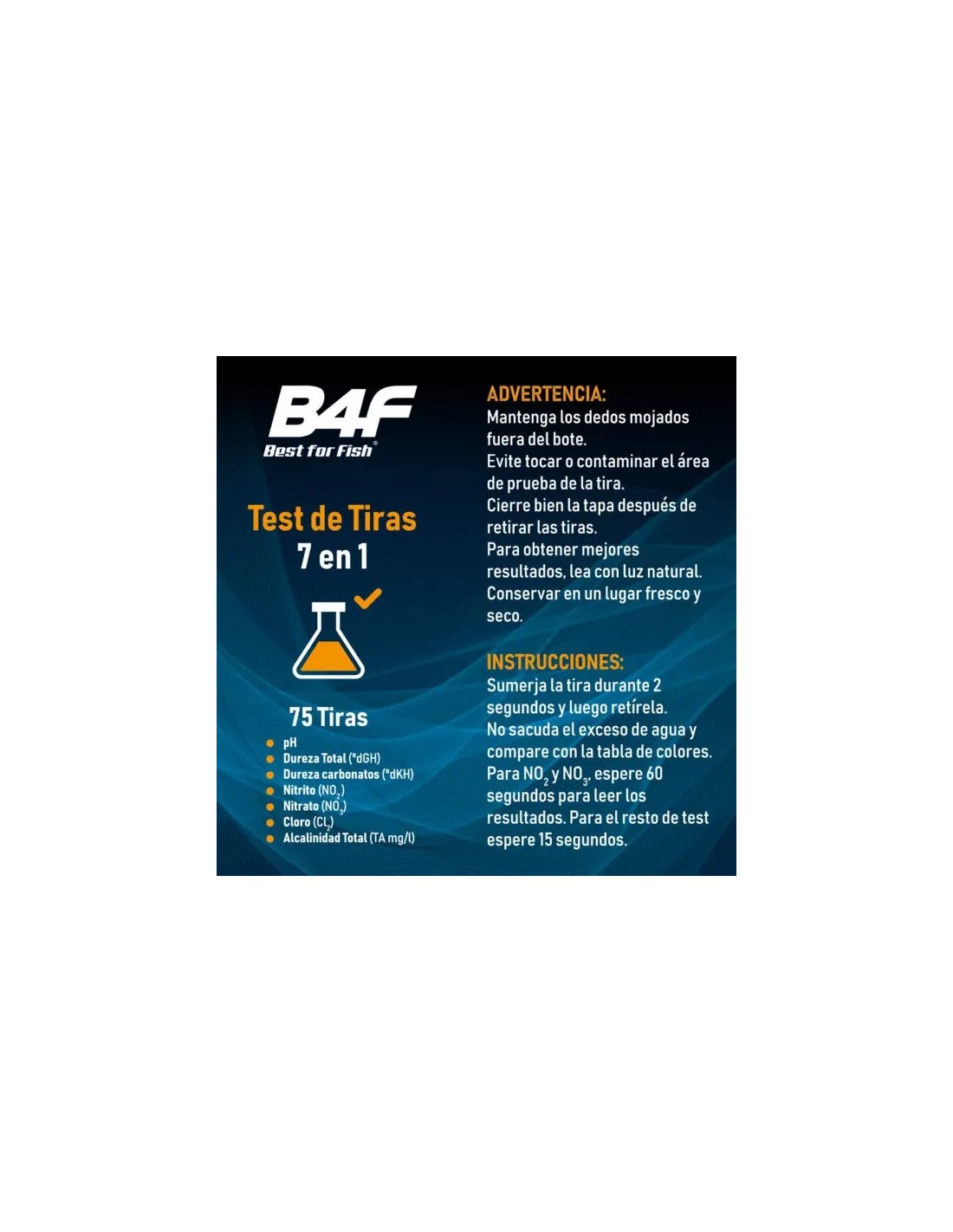 Con el Test de tiras B4F 7 en 1 podrás conocer el estado de calidad del agua de tu acuario fácilmente y en pocos segundos. Mide pH, dureza Total (°dGH), dureza carbonatos (ºdKH), nitrito (NO2), nitrato (NO3), cloro (Cl2) y alcalinidad total (TA mg/l).
