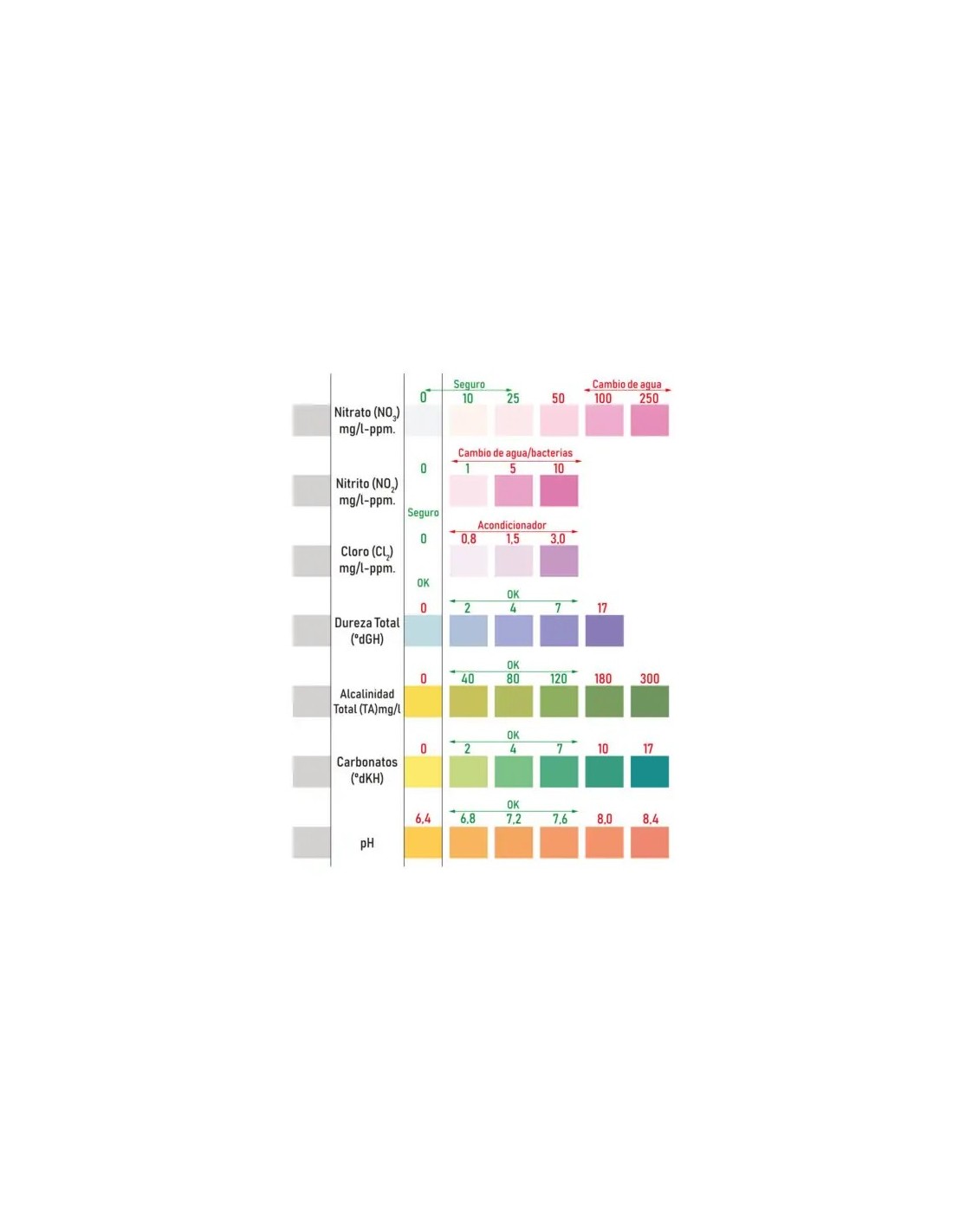 Análisis rápido, preciso y económico del pH, GH, KH, NO2, NO3, Cl2 y alcalinidad total.
