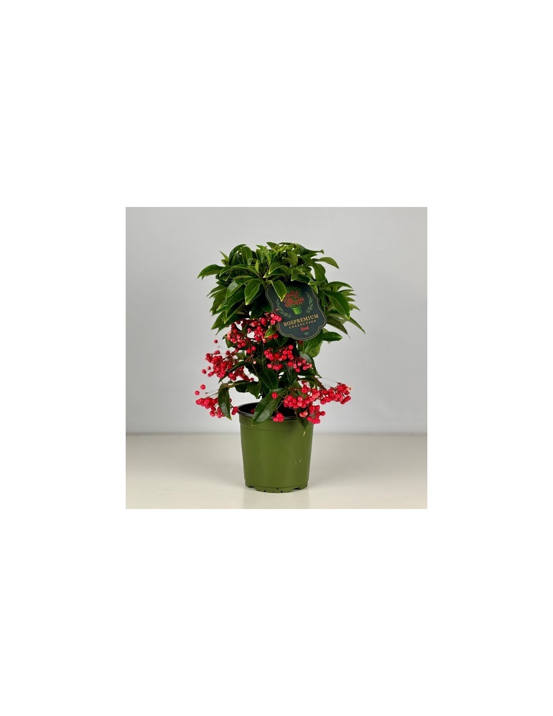 Destaca por su atractivo follaje verde brillante y sus decorativos frutos rojos que permanecen durante meses, aportando color y vitalidad a cualquier espacio.